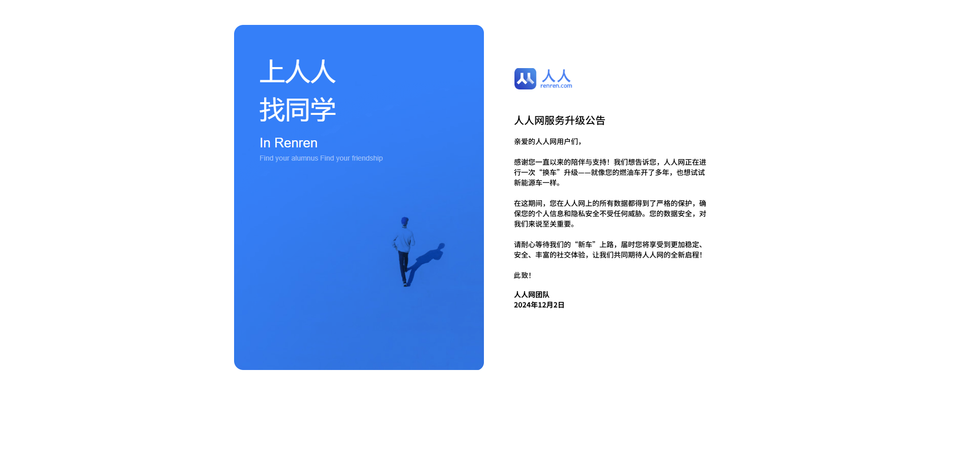 感謝您一直以來(lái)的陪伴與支持!我們想告訴您,人人網(wǎng)正在進(jìn)行一次“換車”升級(jí)--就像您的燃油車開了多年,也想試試新能源車一樣。